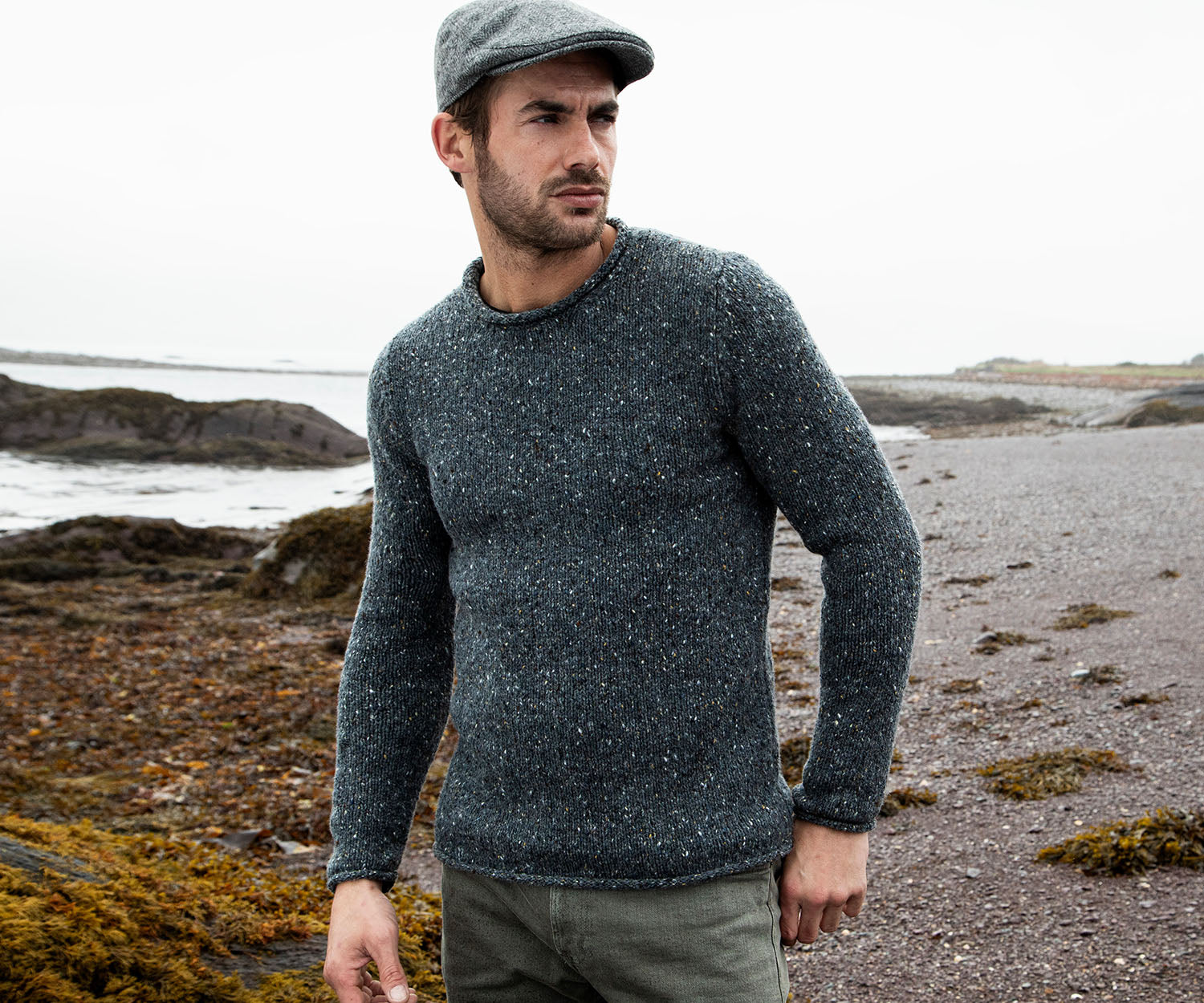 FISHERMAN: Donegal Fleck Round Neck Sweater with Rolled Edges.