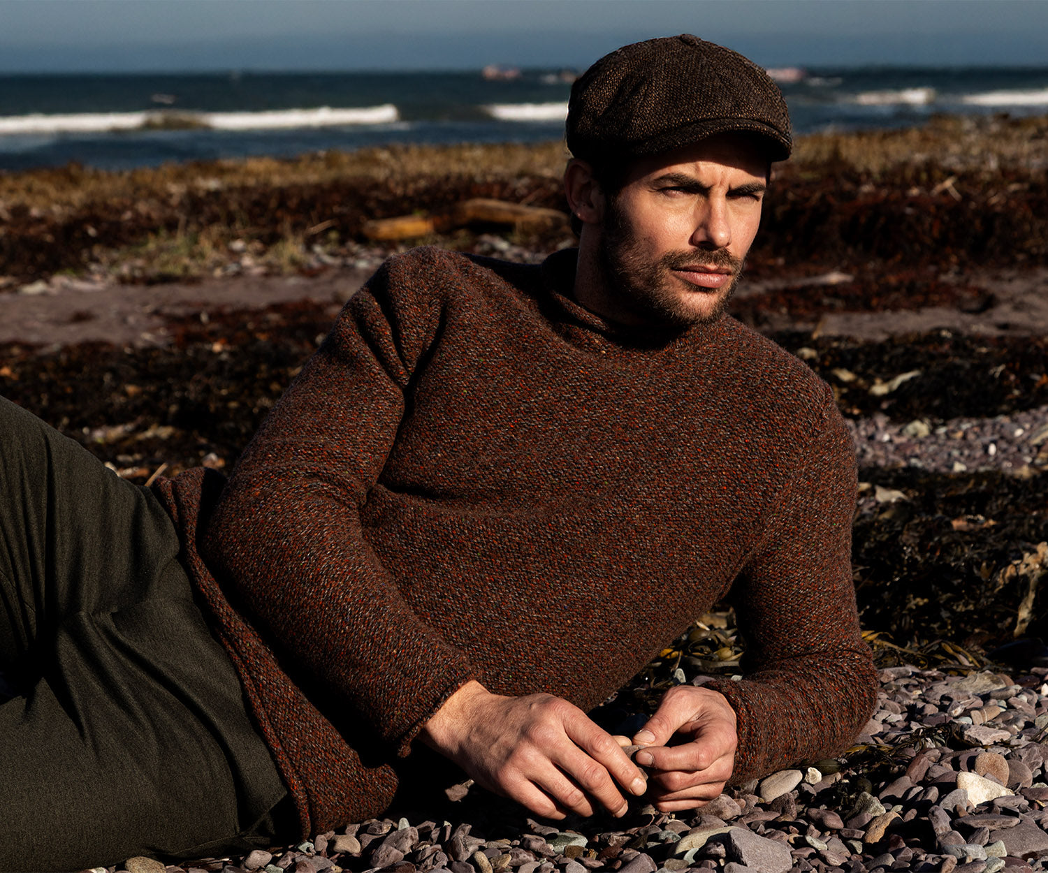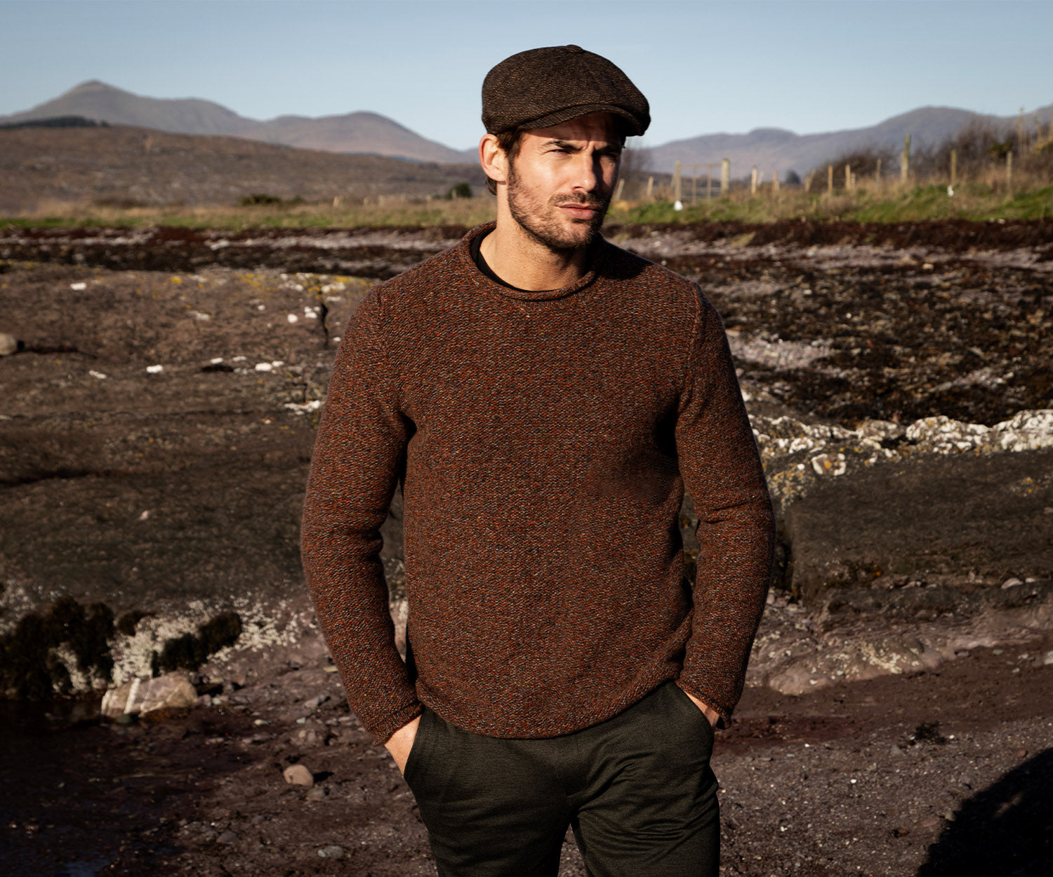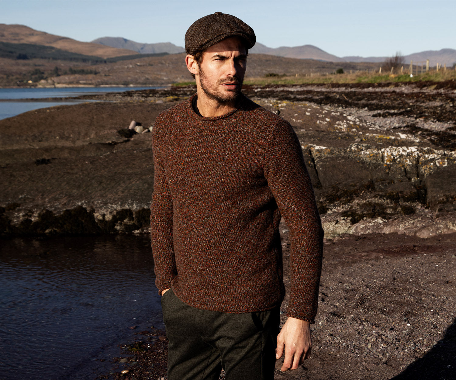 FISHERMAN: Semi Felted, Crew Neck Sweater with Rolled Edges. Colour: Chestnut Brown Wool Blend: 95% Merino Wool and 5% Cashmere. Product Care: Handwash or dry clean. Crafted in Ireland, hand linked and finished by hand. Knit from 100% natural...Read more