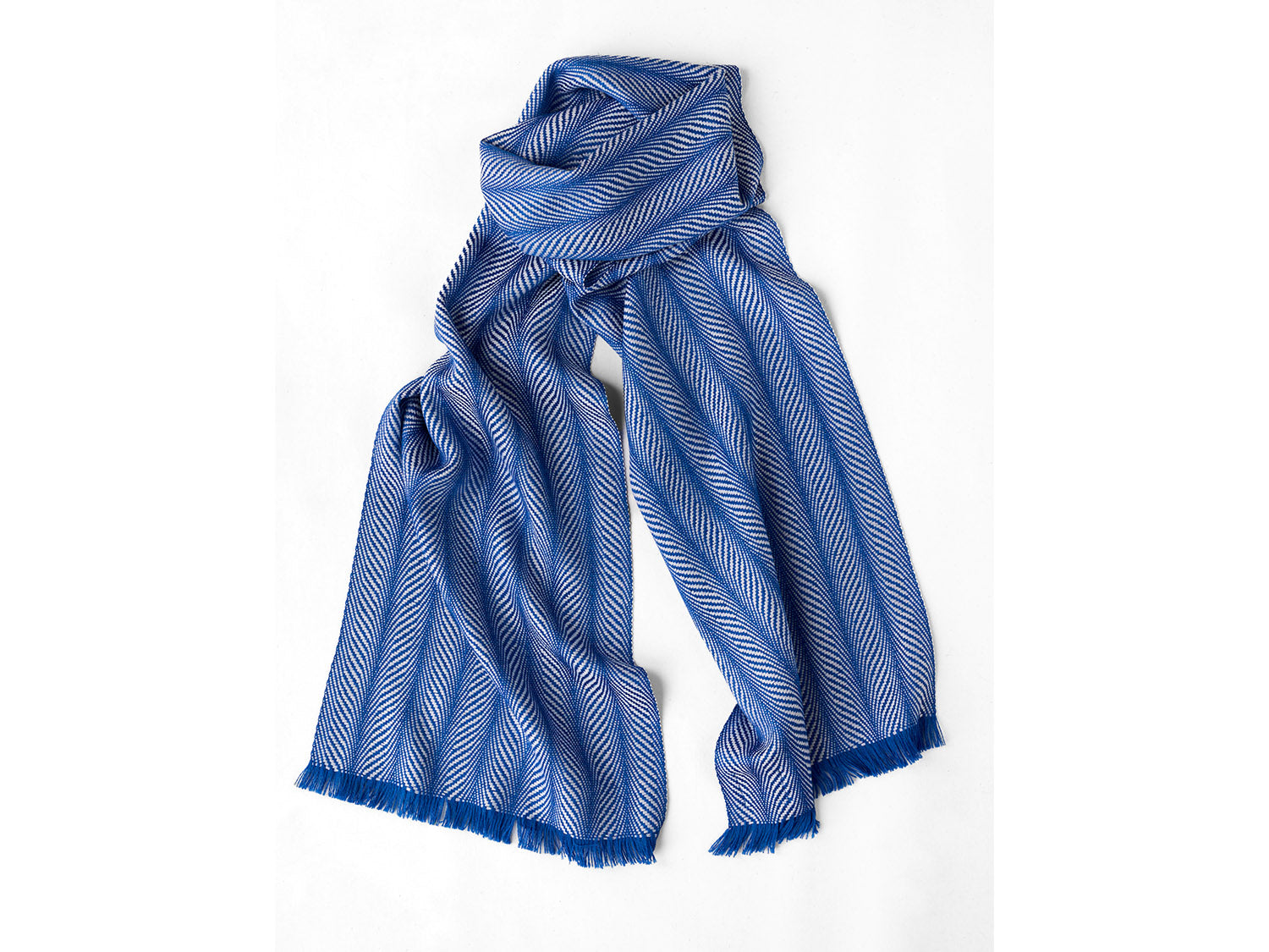 Blue and White 100% Merino Lambswool scarf by Lisbeth Mulcahy. The Lambswool Scarf is another of Lisbeth Mulcahy's classic designs, using a variation of the undulating herringbone pattern. It is a light and elegant city scarf, suitable for...Read more