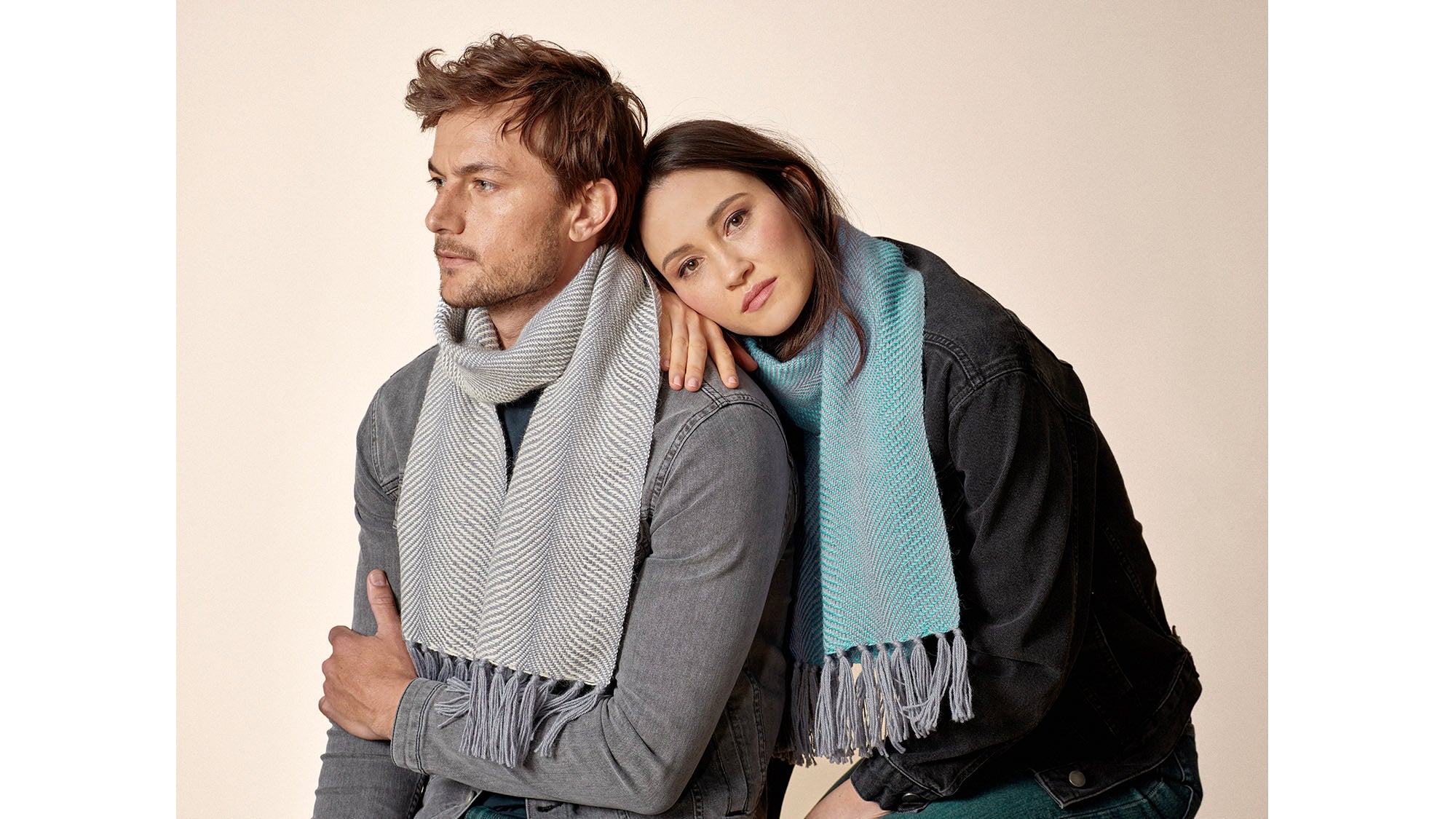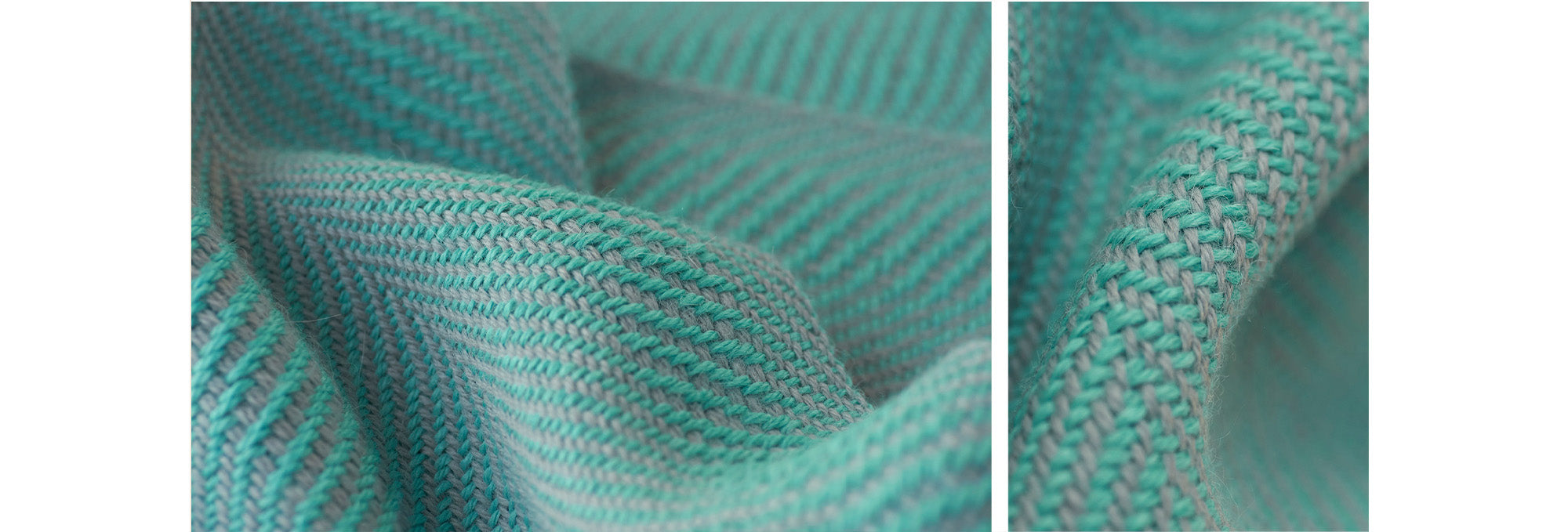 Grey and Turquoise Alpaca Undulating woven scarf by Lisbeth Mulcahy. The Alpaca Undulating Scarf is a classic, designed by Lisbeth Mulcahy in 1986 using an undulating herringbone pattern. It is updated in terms of colour every year since....Read more